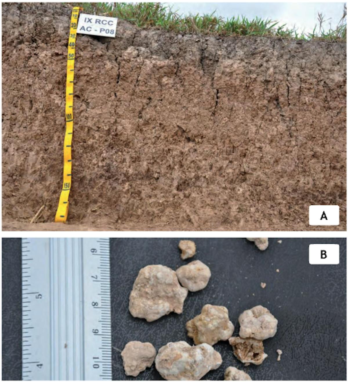 Figura 7. Perfil AC-P08 (A); concreções de carbonato (B).