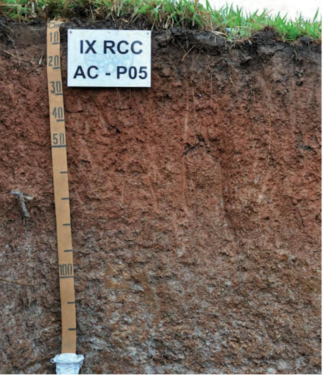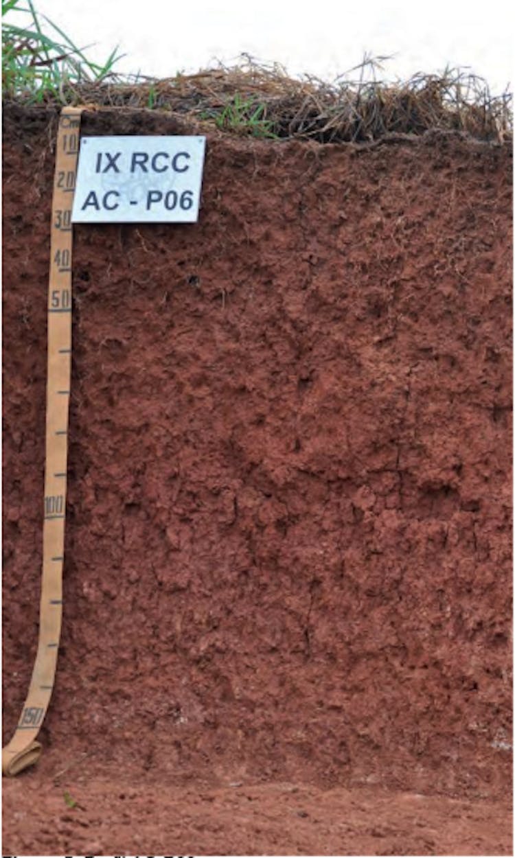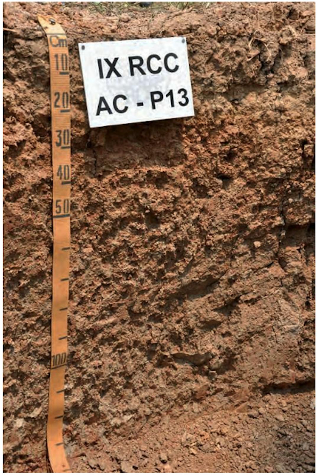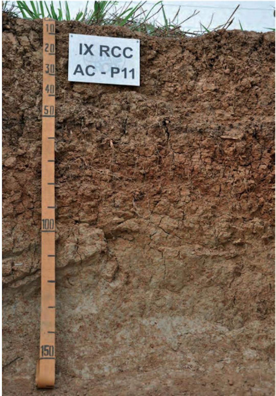 - BC 105–135 cm, bruno-amarelado (10YR 5/6, úmida); muito argilosa; maciça coesa, extremamente dura, muito firme, muito plástica e muito pegajosa; transição abrupta e ondular (29 – 40 cm).