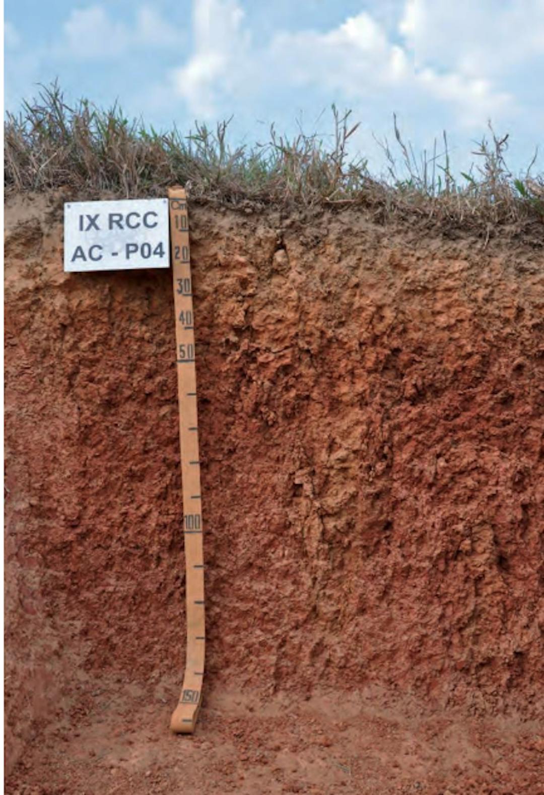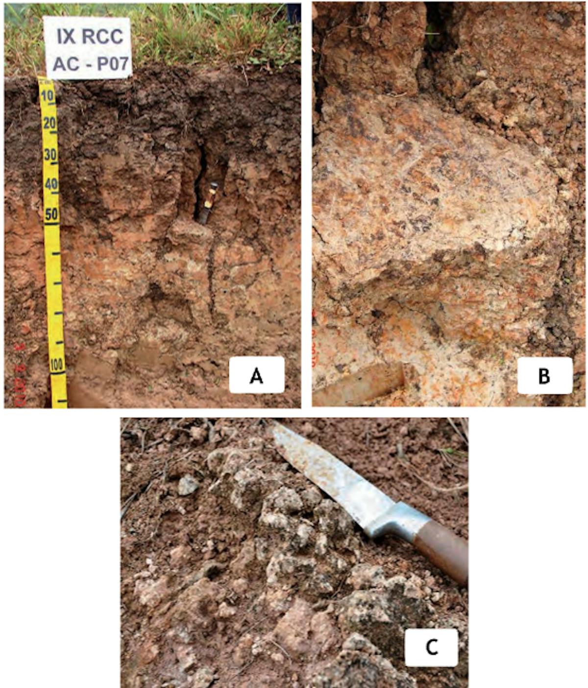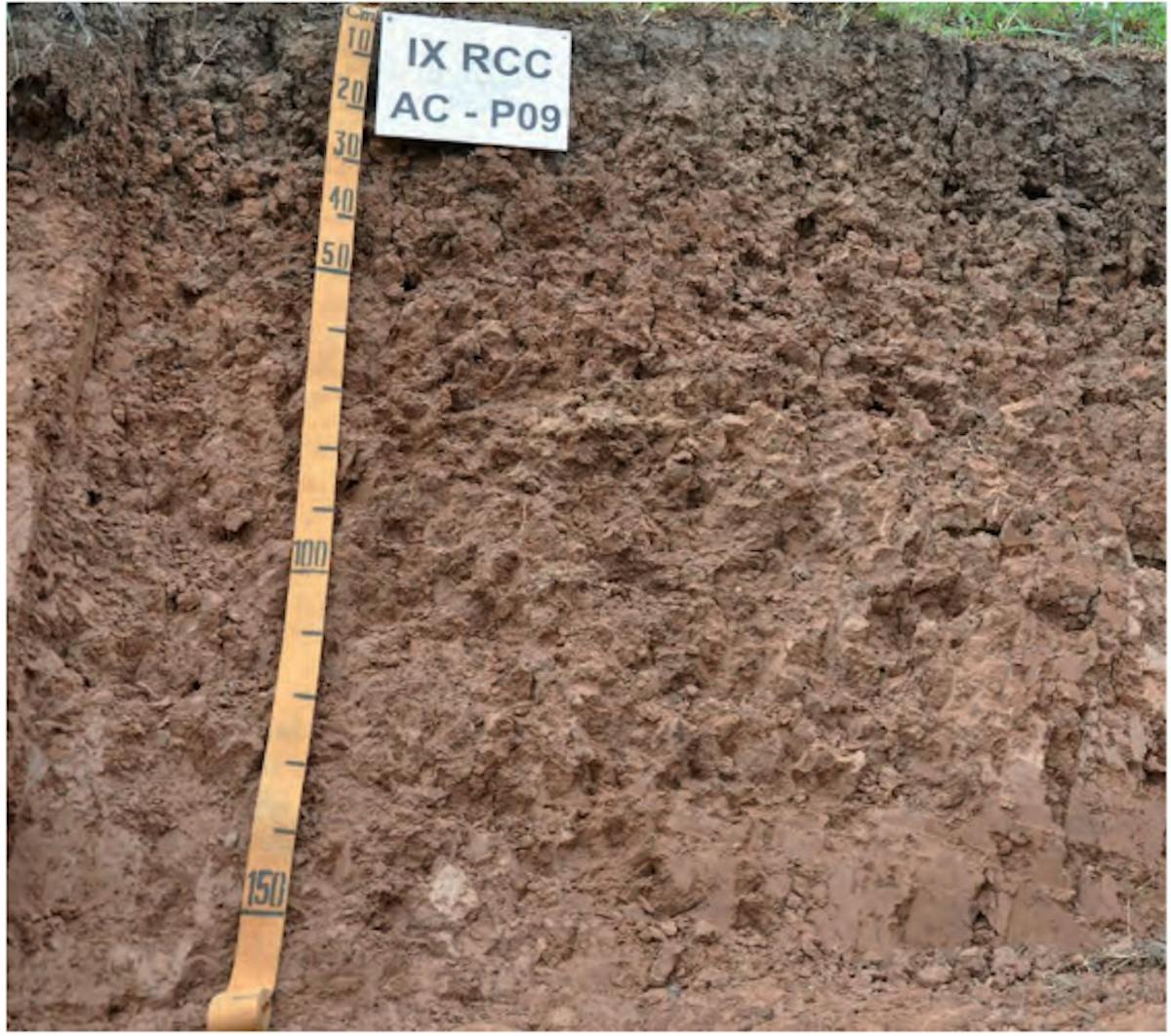 - BC 105–135 cm, bruno-amarelado (10YR 5/6, úmida); muito argilosa; maciça coesa, extremamente dura, muito firme, muito plástica e muito pegajosa; transição abrupta e ondular (29 – 40 cm).